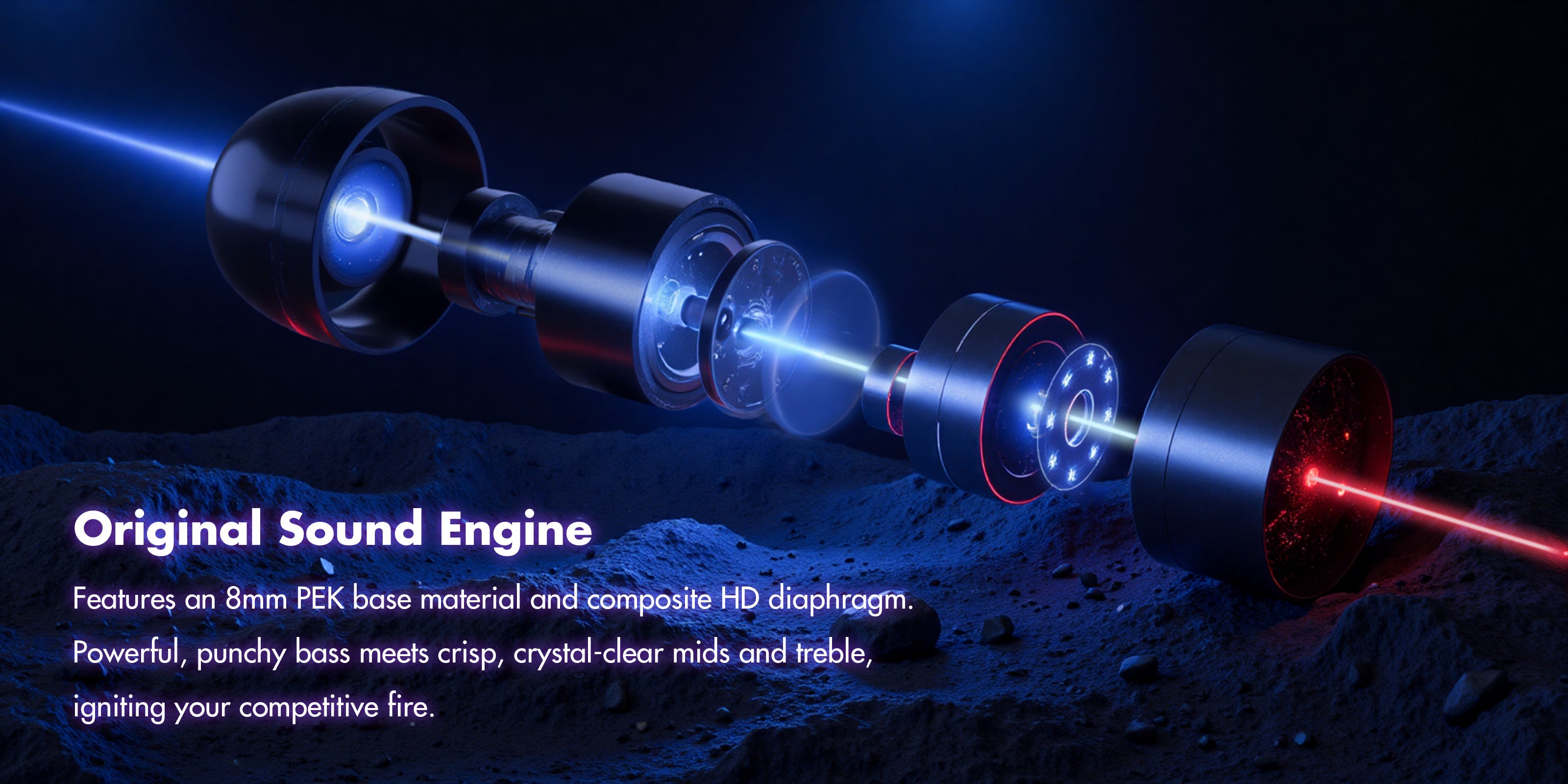 Features an 8mm PEK base material and composite HD diaphragm. Powerful, punchy bass meets crisp, crystal-clear mids and treble, igniting your competitive fire.